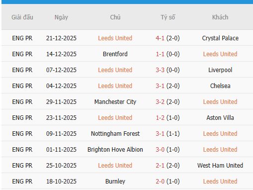 - Trong 5 trận gần đây, Leeds thắng 2, hòa 2, thua 1